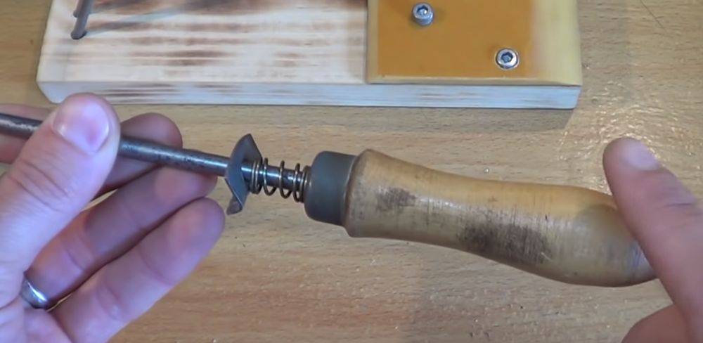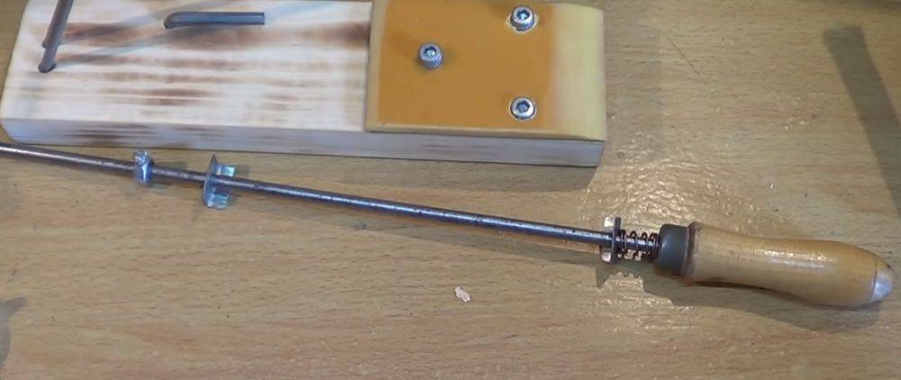 стороны прутка одеваем деревянную ручку, пружину и крепежный уголок.