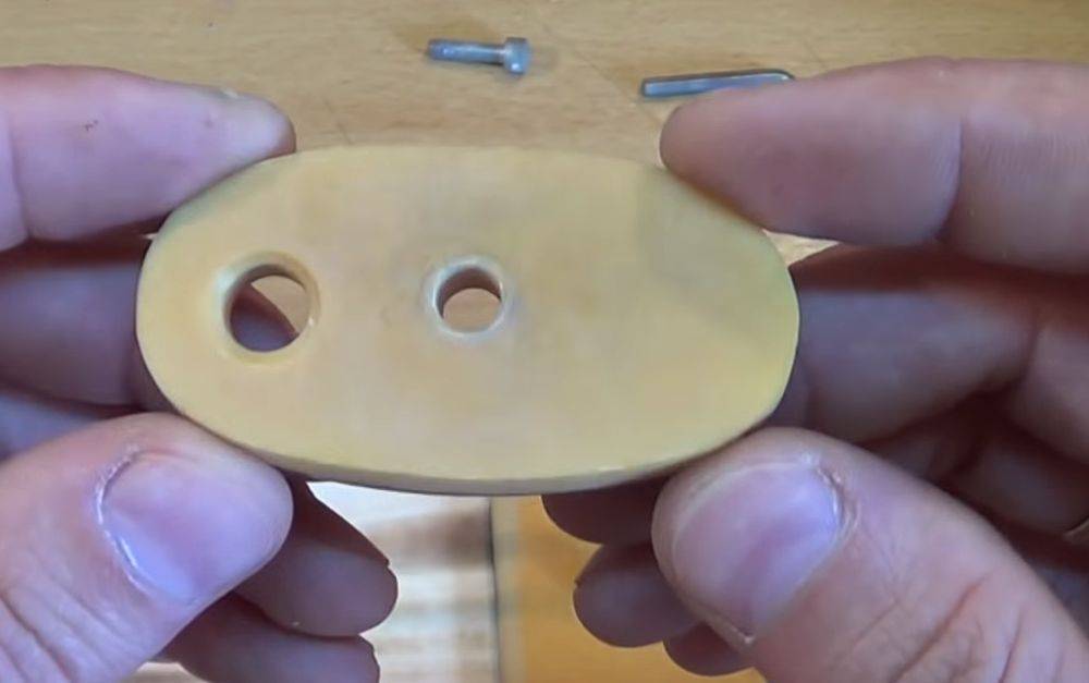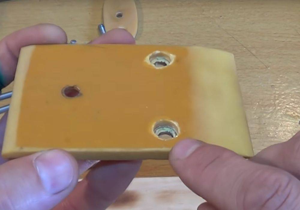 Из листа текстолита вырезаем прижимную пластину и сверлим в ней 3 отверстия диаметром 7-8мм. В отверстиях желательно сделать потаи для шляпки болта.