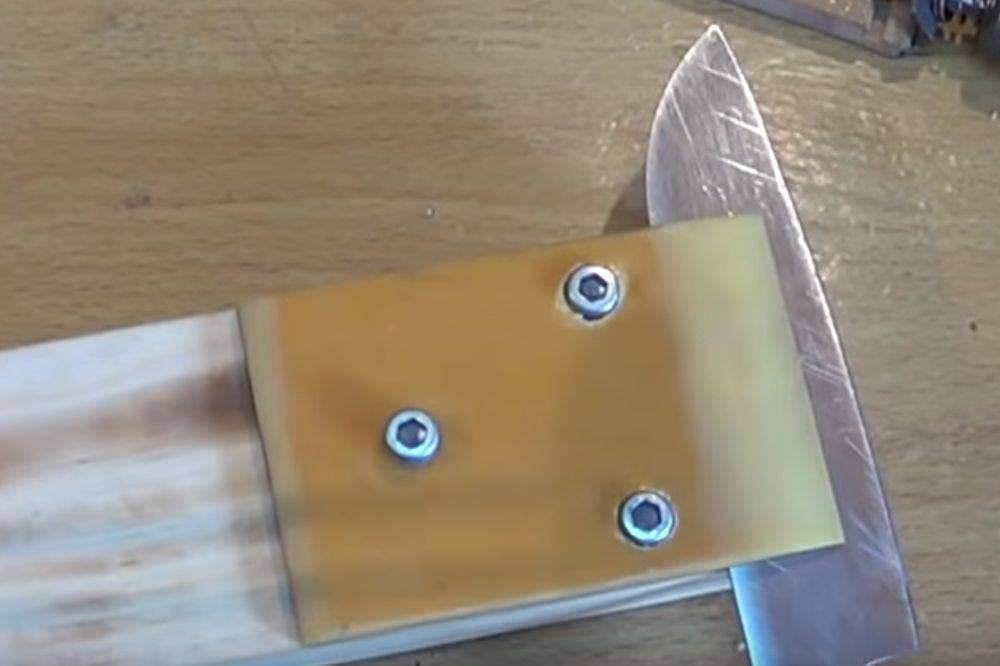 После закрепления деревянной части удерживающего устройства, можно приступить к прикреплению железной пластины. В центе пластины 200*65 мм нужно просверлить продолговатый паз, длиной 90 мм и шириной около 1 см. Паз должен располагаться от края зажимной пластины на расстоянии 60 мм. Дополнительно требуется просверлить отверстие на расстоянии 20 мм от противоположного края и нарезать в нём резьбу под болт М8. Затем нужно прикрепить при помощи этого болта зажимную пластину на подготовленное ранее деревянное основание. При помощи ещё одного болта и подходящей шайбы необходимо зафиксировать зажимную пластину по центру вырезанного паза. Фиксация должна быть чёткой, но при этом аккуратной, чтобы не повредить поверхность клинка.
