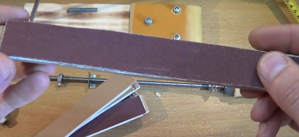 В качестве точильного камня будем использовать наждачную бумагу, наклеенную на какой-либо прямоугольный брусок. Лучше всего изготовить брусок из толстого стекла, так как оно имеет идеальные ровные и гладкие кромки. Мы же изготовим брусок из куска ламината. С ним гораздо легче работать, чем со стеклом и в нем уже есть необходимые пазы.