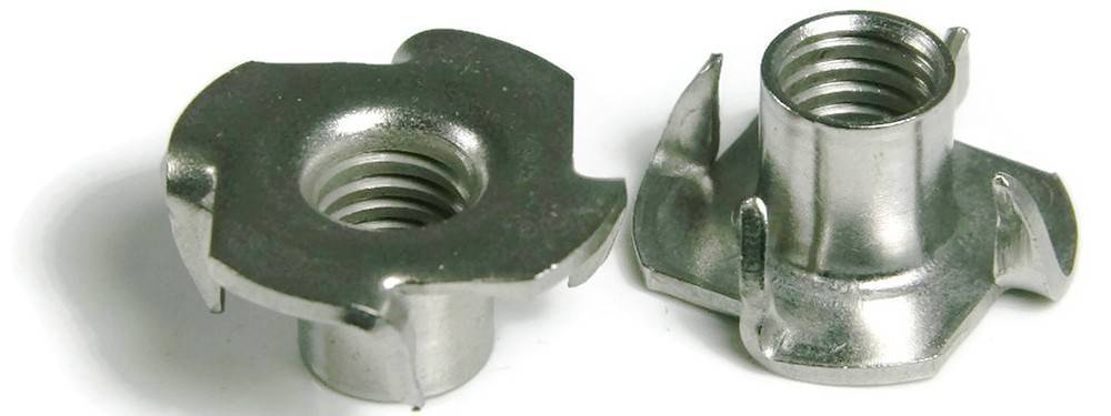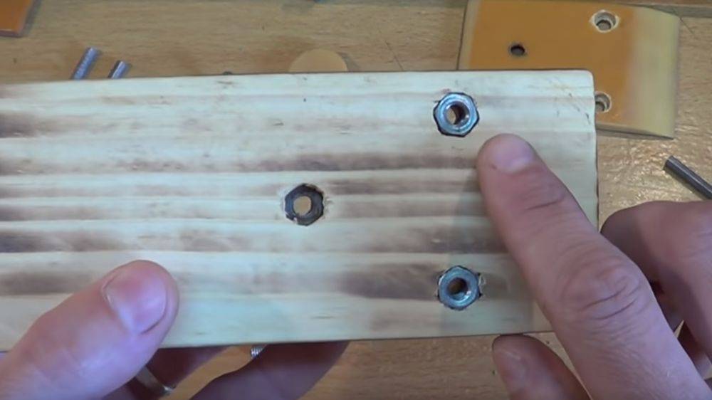 Запрессовываем в отверстия для прижимной пластины 3 мебельных гайки м6.