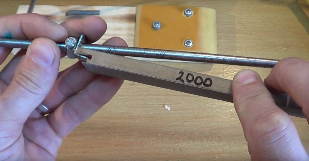 Оселок соединить с направляющим штоком, в качестве которого выступает стальной стержень с сечением 8 мм. При соединении оселка и направляющего штока следует строго следить за тем, чтобы их осевые линии совпадали. При желании, для удобства пользования точилкой, к оселку с обратной стороны можно приспособить ручку-держатель. Осталось закрепить оселок в направляющем механизме, зафиксировать барашком и самодельное приспособление для заточки ножей готово.