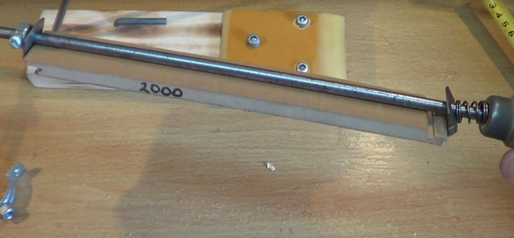 На верстаке, рядом с точилом крепятся направляющие, с помощью которых можно менять расстояние от упора для ножа до вращающегося круга. Этим расстоянием определяется угол заточки. Вертикальная штанга должна иметь свободный ход вверх-вниз с прочной фиксацией положения.