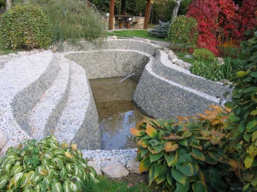 После нужно смоделировать русло ручья, выложить камнями, посадить растения у пруда. Для красоты прибрежную зону ручья и пруда засыпать мелким щебнем. Окантовку водоема можно выложить природным камнем, галькой, самодельными плитами из бетона.