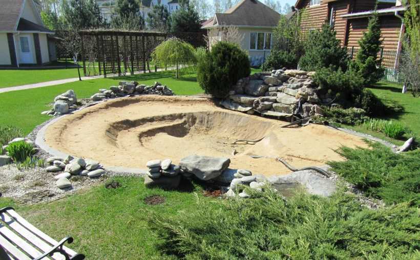 Желательно начинать строительство пруда до возведения основных дачных сооружений. Это позволит применять тяжелую спецтехнику без ограничений, связанных с риском повреждения готовых конструкций. Кроме того, при выкапывании котлована под водоем высвободится большой объем земли, которую надо куда-то пристроить.
