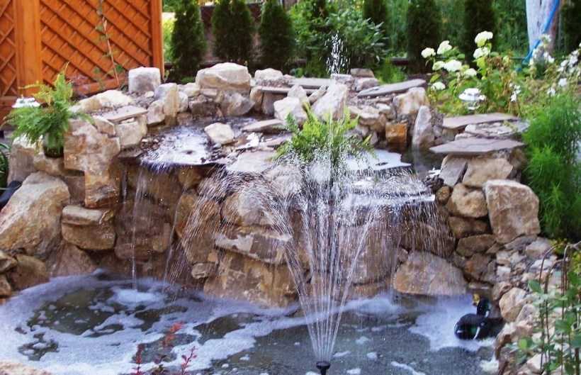 Точно так же, камнями и прибрежными растениями, маскируется и аппарат для фильтрования воды, который устанавливают недалеко от берега. Для него из камней можно сложить небольшой грот, а от него ступенями выложить каскад, по которому будет красиво сбегать чистая вода.