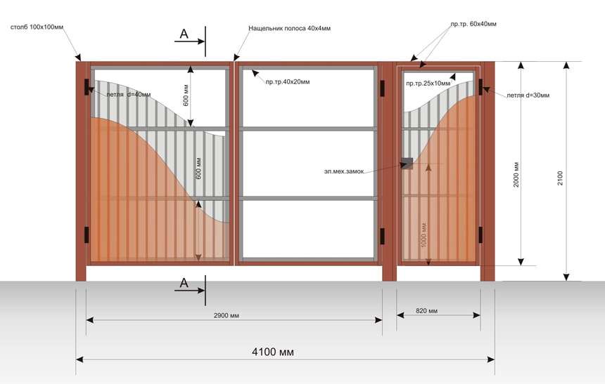 - Разработать подробный чертеж с указанием размера и месторасположения калитки, дополнительными петлями, элементами усиления, подключение автоматических устройств.
