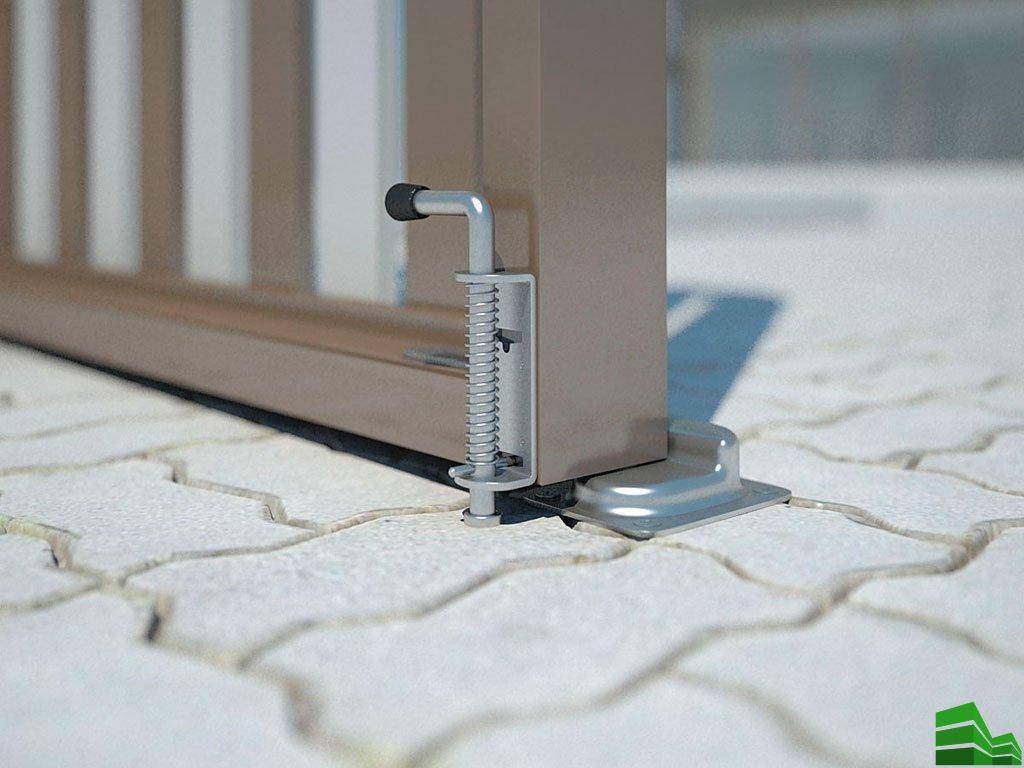 При закрывании вертикальная труба ворот упирается в столб и порывы ветра дующие наружу не смогут вырвать привод. А винтовая конструкция привода не позволит вдавить ворота вовнутрь.