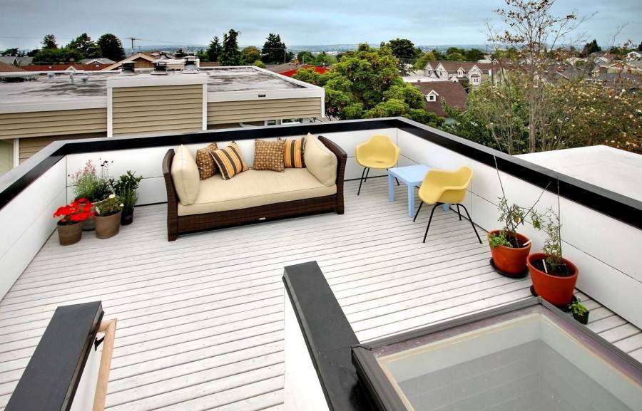- Эксплуатируемые. Главной особенностью данного типа является достаточно мощное основание, иначе возникает вероятность повреждения слоя гидроизоляции. Профнастил либо стяжка из бетона, выступающие в качестве основания, позволяют создать необходимый уклон для обустройства водостока. Теплоизоляция на такой кровле должна быть стойкой к серьезным нагрузкам. Делается это все для того, чтобы крышу дома использовать в каком-либо качестве, будь то рабочая площадка или зона отдыха.