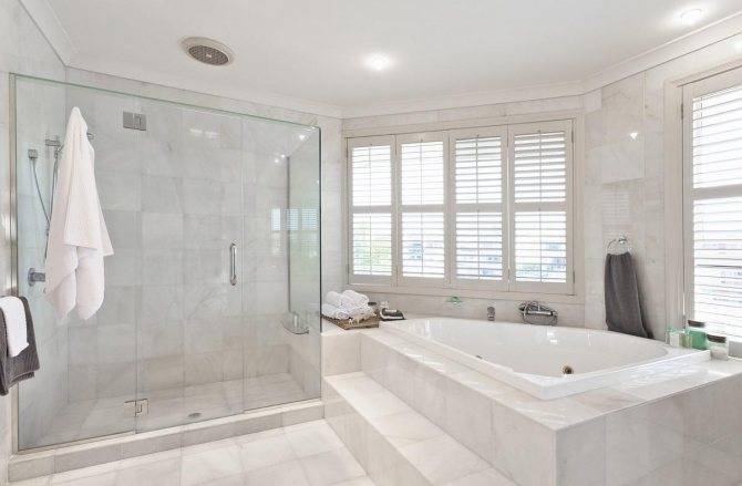 Черты классического стиля с оттенком роскоши: ванна на декоративном подиуме, легкие шторы с кистями, античные колонны, люстра с комплектом бра