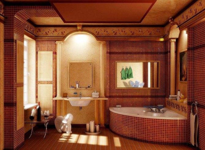 - Восточный. Облицовка стен, пола и потолка делается преимущественно из кафеля. При этом предпочтение отдается материалам золотых, желтых и сиреневых оттенков. Допускается украшение помещения самодельными элементами, выполненными в восточном стиле: вязаными ковриками, кувшинами и вазами.