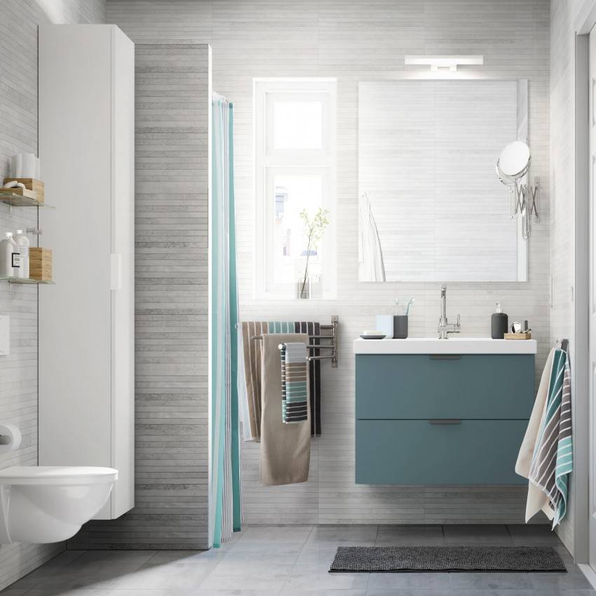 - Размещение навесной мебели, сантехники придаст легкости помещению.