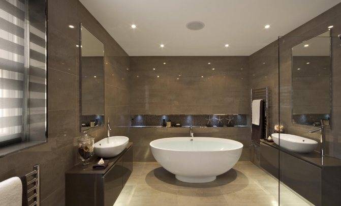- Современный. Подойдет для просторных ванных, т. к. этот стиль предполагает размещение ванны в середине помещения, а также зонирование пространства, что невозможно сделать в маленькой комнате.