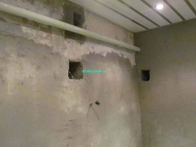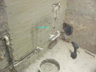 После ремонта в санузле у нас будет 3 точки разбора воды – одна около раковины, другая – у ванной, третья – у унитаза. К двум точкам выведем трубы холодного и горячего водоснабжения, к унитазу – только холодного. После того, как мы закрепим полипропилен в штробах — прикрутим к фитингам вентили и подадим воду. Необходимо проверить систему на отсутствие протечек прежде, чем начнём штукатурные и плиточные работы. В нашем случае оказалось всё в норме, можно начинать штукатурку стен. Но перед этим мы сделаем ещё небольшие штробы, чтобы в них спрятать электрические провода. В санузле была розетка, которая располагалась слишком высоко от пола. Во время ремонта мы удлиним проводку и опустим её пониже.