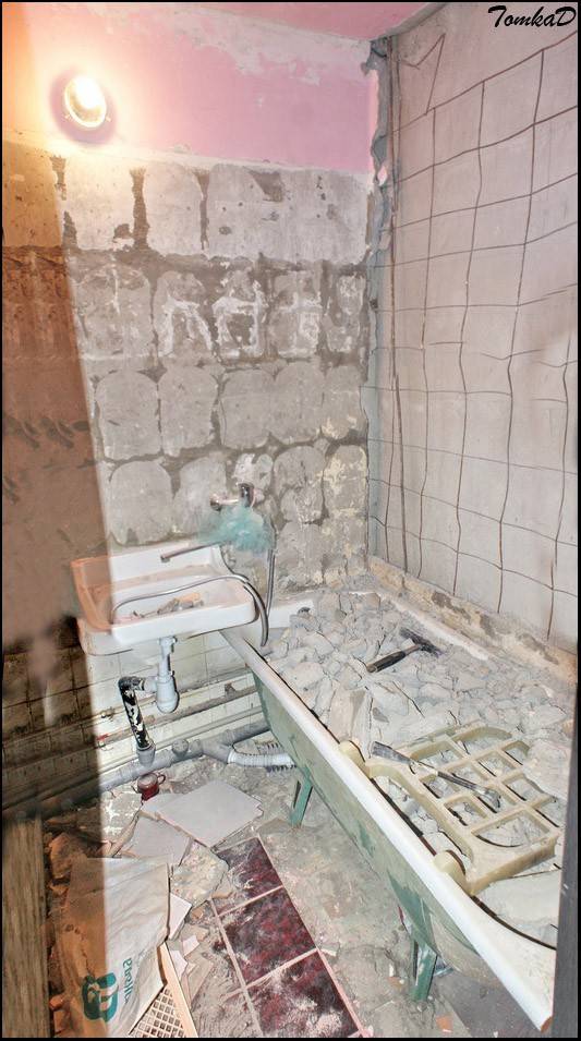 Если габариты не позволяют её пронести в собранном состоянии, то нужно аккуратно разобрать. После этого наступает этап отключения ванны и умывальника. Для этого перекрывается подача воды и отсоединяются смесители, сливные трубы, после чего сантехника переносится в другое помещение, либо, в случае её негодности для дальнейшей эксплуатации, вывозится и выкидывается на свалку. Чтобы добраться до стен придется срезать болгаркой трубы, предназначенные для сушки полотенца, снимать батареи и т. п. После демонтажных работ должна остаться пустая комната, с двумя вводами горячей и холодной воды, а также канализационной трубой.
