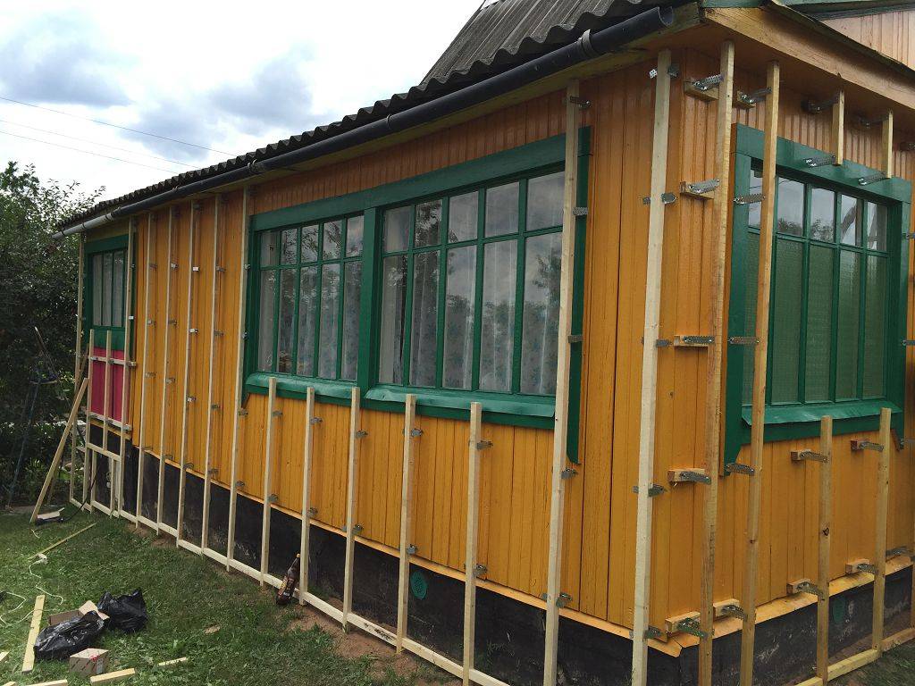 Чтобы качественно утеплить стены постройки, между профилями обрешётки рекомендуется уложить утеплитель (пенопласт, базальтовую либо минеральную вату). Выбор утеплителя зависит от климатических условий на территории, где находится дом.