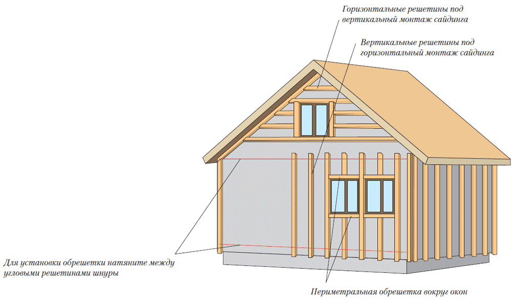 Монтаж своими руками обрешетки выполняют, учитывая способ крепления сайдинга: под горизонтальное крепление понадобится вертикальный каркас, и наоборот.