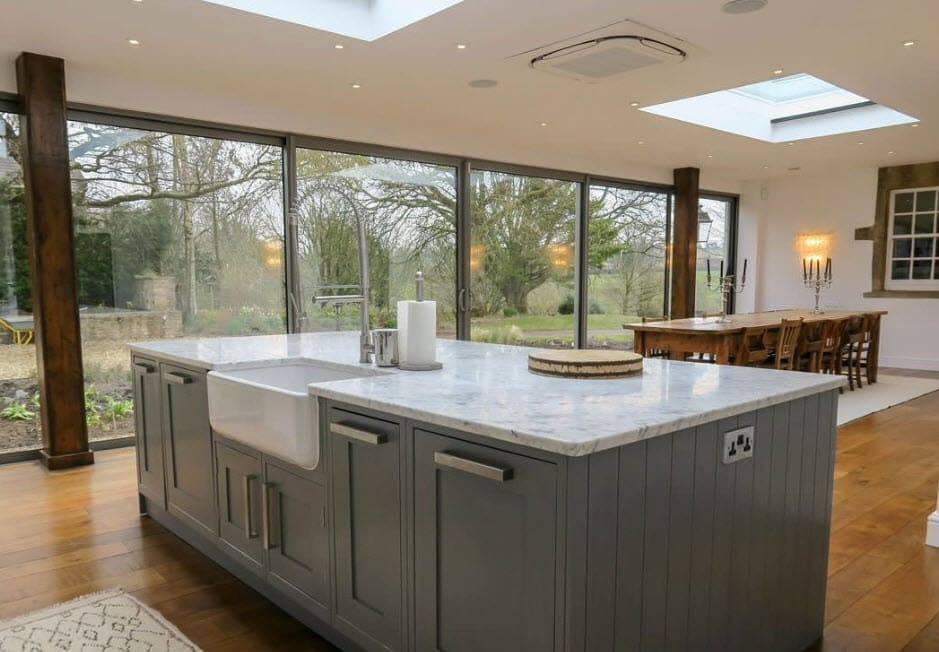 При разработке проекта дизайнеры учли, что в доме много окон. Поэтому прекрасной идеей стало размещение кухонной зоны вдоль одного из них. По бокам симметрично расположены пеналы, посередине – шкафы внизу.