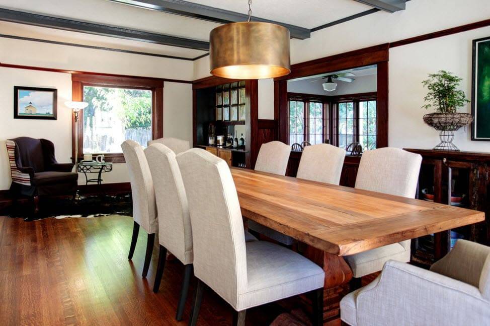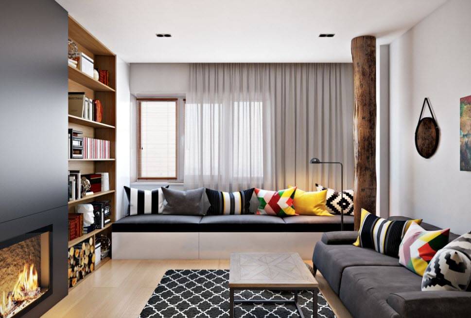 Это, к слову, неплохой способ отвлечь внимание от небольшого метража. Помните, что мебель должна быть деревянной