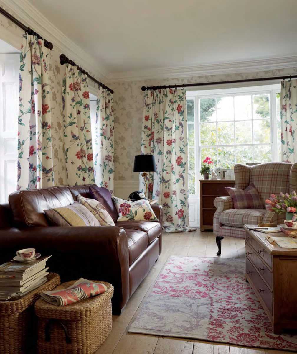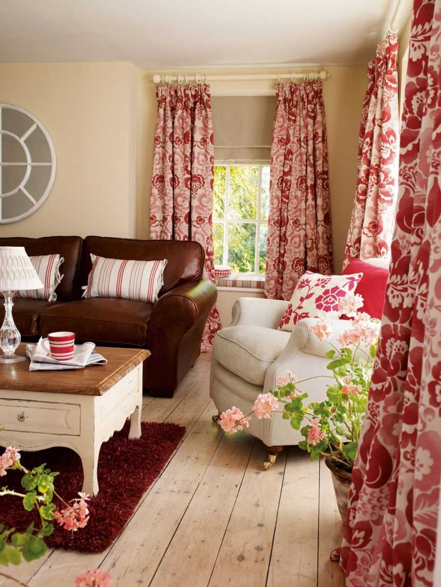 Отлично будет смотреться на деревенских шторах ручная вышивка, а дополнительное очарование комнате придадут скатерти или подушки, созданные из той же ткани.