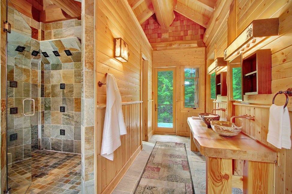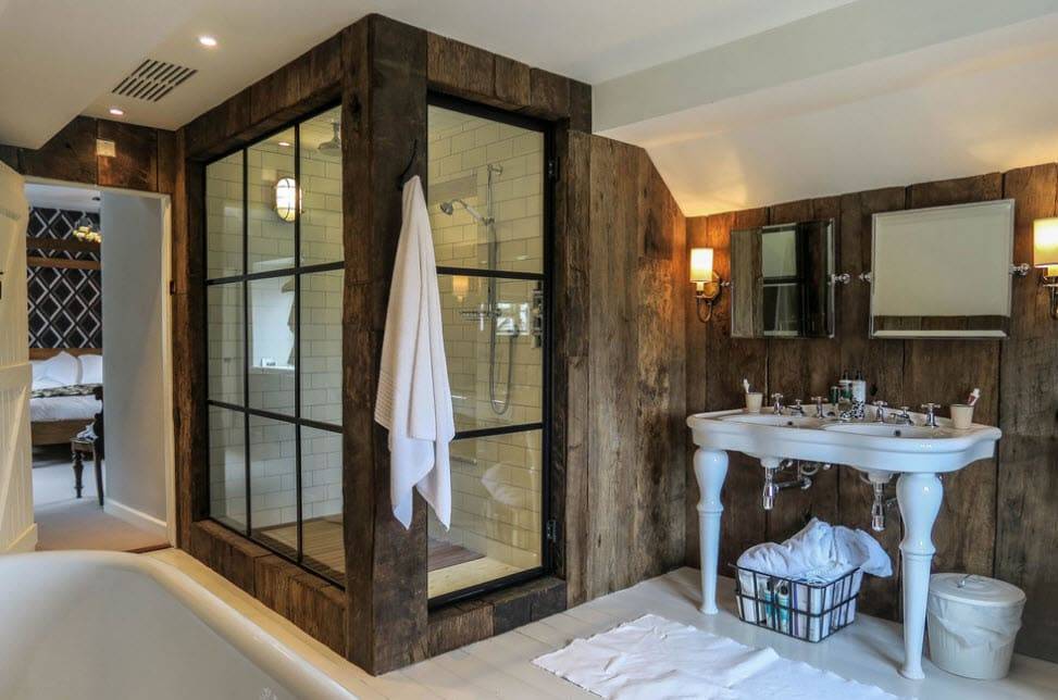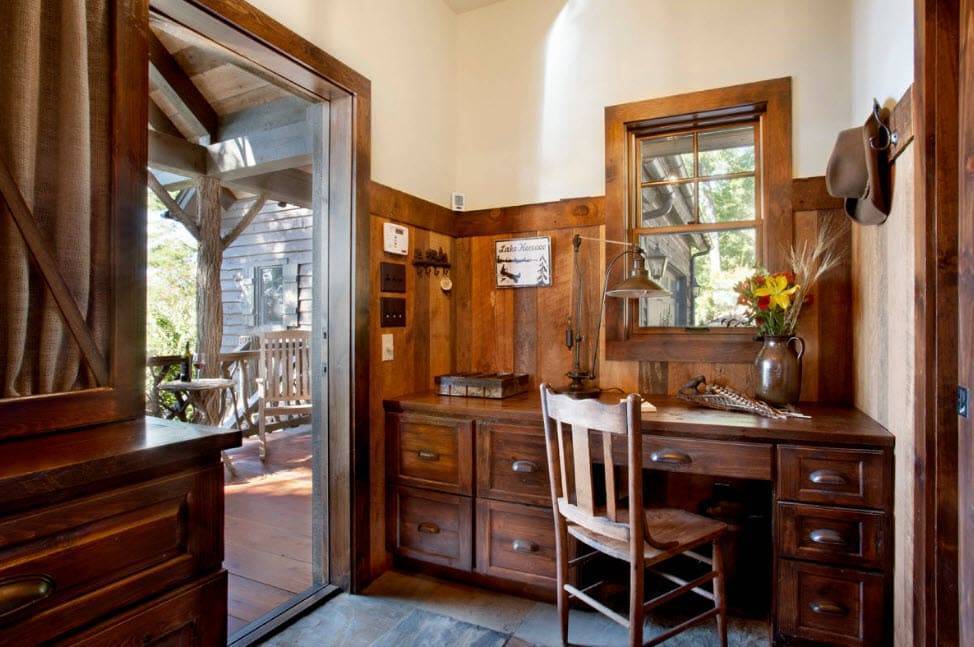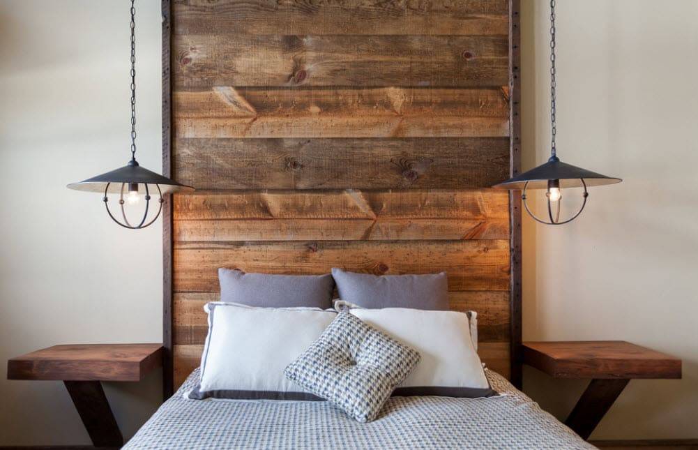 Среди всех вариантов, подходящих для решения рассматриваемой задачи, наиболее видное место занимают стены из натурального дерева. Альтернативой является использование качественной имитации данного материала, предусматривающее применение декоративных панелей или обоев. Другая особенность, характерная для такой отделки – умеренная грубость, предполагающая отказ от идеально ровных линий.