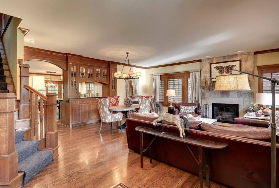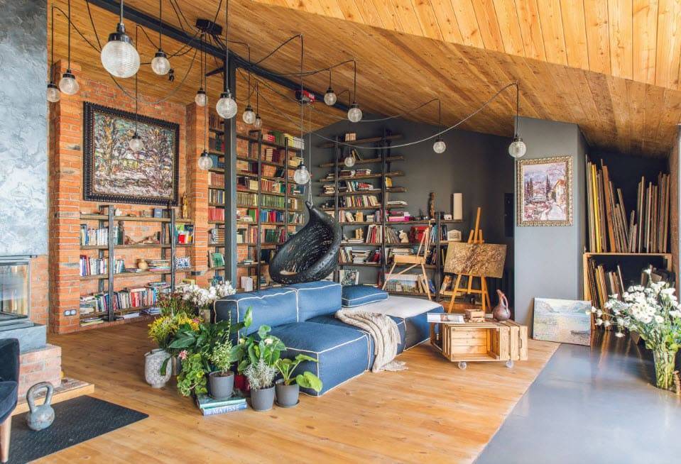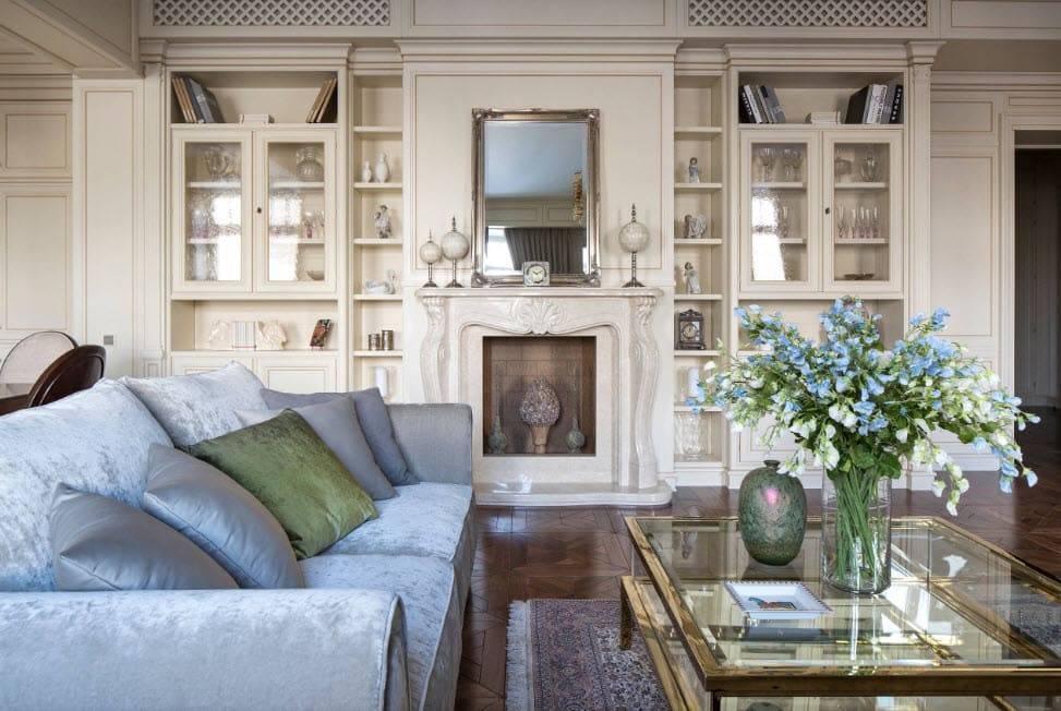 Благодаря перегородке, пространство у камина стало более приватным. Теперь это прекрасный уголок для чтения и спокойного отдыха. Сам камин выложен светлыми изразцами. Таким образом, стал объединяющим элементом между потолком и полом.