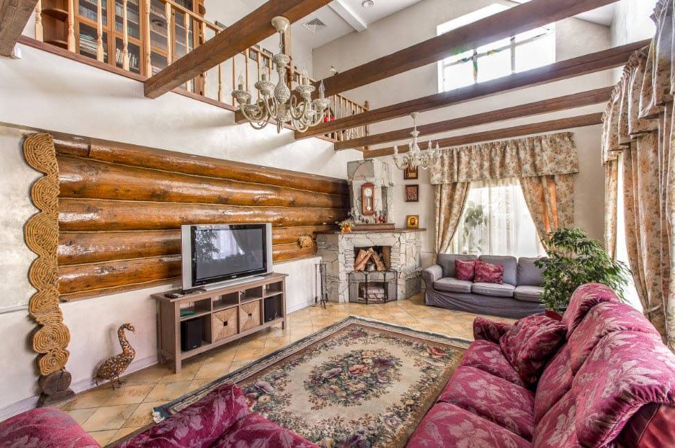Потолок. Уместной будет побелка или покраска; можно покрыть потолок деревянной вагонкой, или сделать его натяжным. Стильный вид будет у деревянных балок, даже если это имитация. Главное условие – выбирайте только матовые поверхности.
