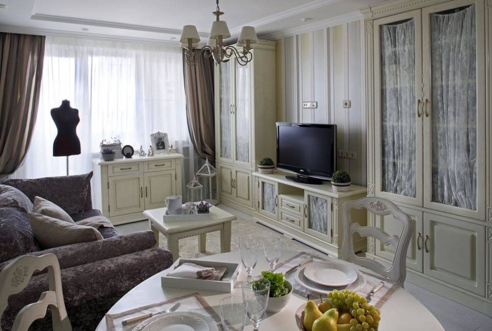 - В выборе мебели предпочтение отдаётся удобному, но не слишком массивному деревянному столу и стульям; пластик или стекло разрушат ощущение домашней обстановки. Комнату украсят вместительные системы хранения: полки, напольные и навесные шкафы.