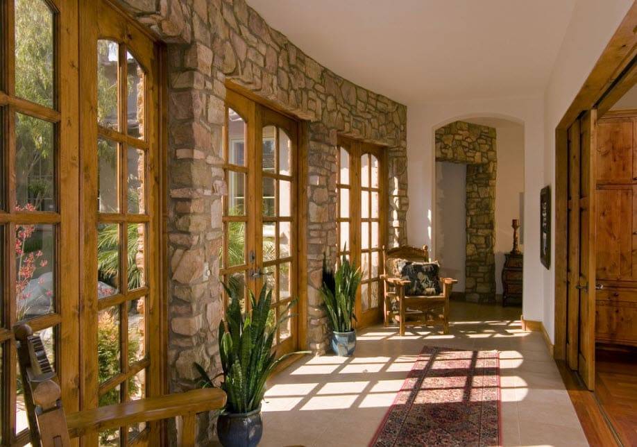 Все поверхности обрабатываются только натуральными материалами. На стенах декоративная штукатурка, облицовочный камень или кирпичные панно. На полу дерево, матовая керамическая плитка, специально состаренный ламинат.