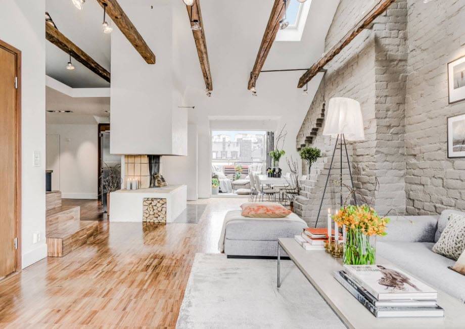 В гостиной зоне деревянный пол покрыт белой эмалью. Подобный прием по задумке авторов придает комнате легкости, что очень приветствуется в скандинавских традициях.