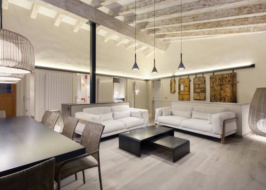 Невысокие потолки покрасили в белый, чтобы визуально приподнять их. Балки также прекрасно выполнили свою функцию, зрительно отодвинув потолок. Кроме того, они стали основой для точечного освещения.
