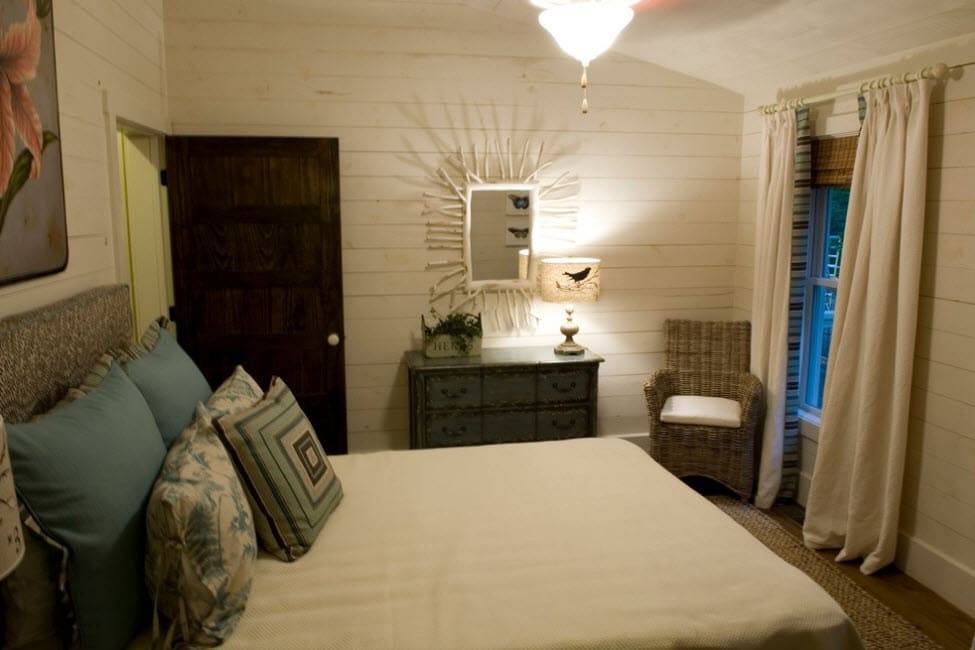 Чаще всего стены в деревенском стиле обходятся без обоев. Обычно это краска, не глянцевая, приглушенная, служащая хорошим фоном. Белый цвет встречается чаще, и это понятно: он всегда ассоциировался с чистотой, порядком, скромностью. От него трудно устать.