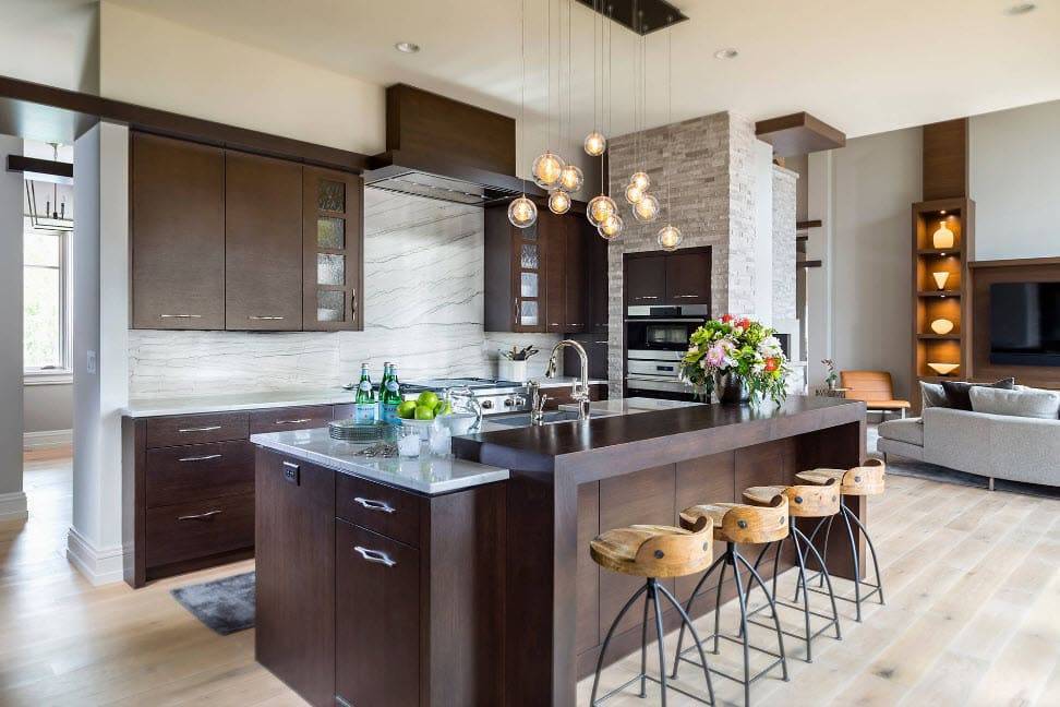 Нужно учитывать исходные данные. Если это кухня-гостиная, то объединенное помещение с двумя функциональными зонами должно быть стилистически выверено. И такой переход не должен предполагать наличия хромированных поверхностей, металлика, стеклянной перегородки между зонами, скорее, в большей степени присущих стилю хай-тек.