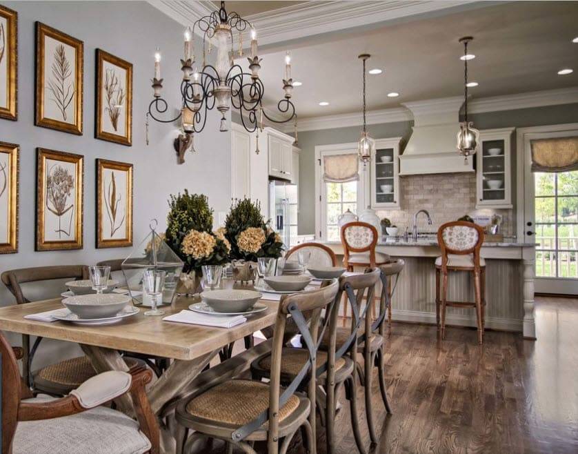 В современных интерьерах отделка кухни и столовой в стиле кантри зависит от цвета кухонного гарнитура. Цветом выделяют либо мебель, либо отделку помещения. В остальном придерживаются следующих правил: