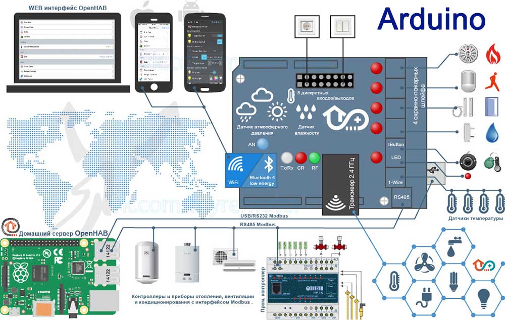 - датчиков: температуры воздуха, влажности, протечек, дыма, движения.