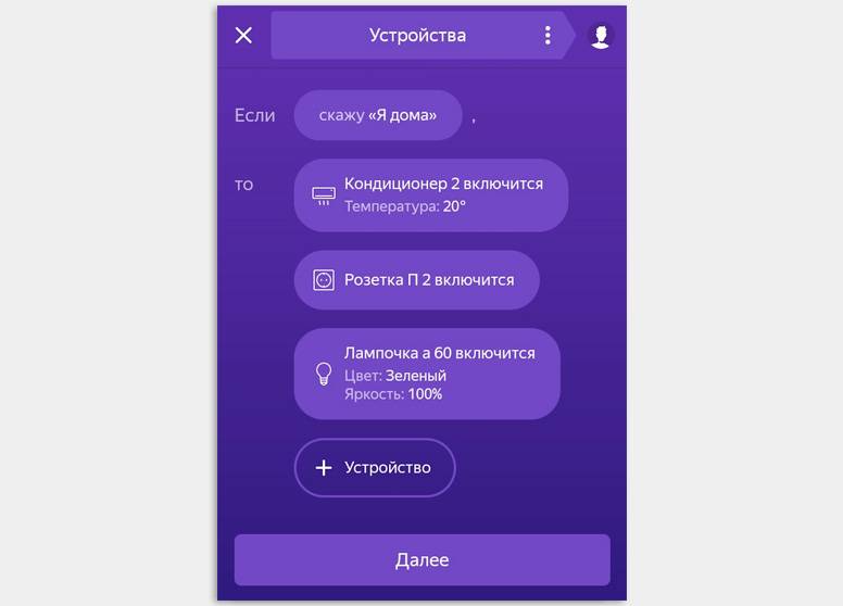 В результате включится кондиционер на 20 градусов, включится умная розетка (ее можно задействовать по-разному, от включения радио приёмника, торшера, телевизора, медиацентра, до чайника или мультиварки) и свет с теплым зеленым оттенком.