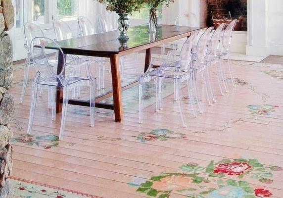 Ситцевые полы не зря называют современным аналогом паркету. В сочетании с лаком материал образует долговечное покрытие, устойчивое к повреждениям и влаге. Однако, в отличие от паркета, ситец стоит гораздо дешевле и выглядит симпатичнее и современнее. И стелить столь оригинальное покрытие можно практически везде: в гостиной, спальне, столовой и даже на кухне.