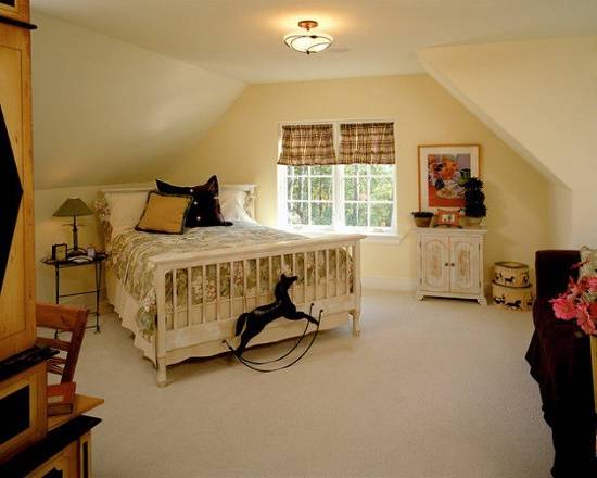 Бежевые обои в спальне. Фото небольшой мансардной комнаты