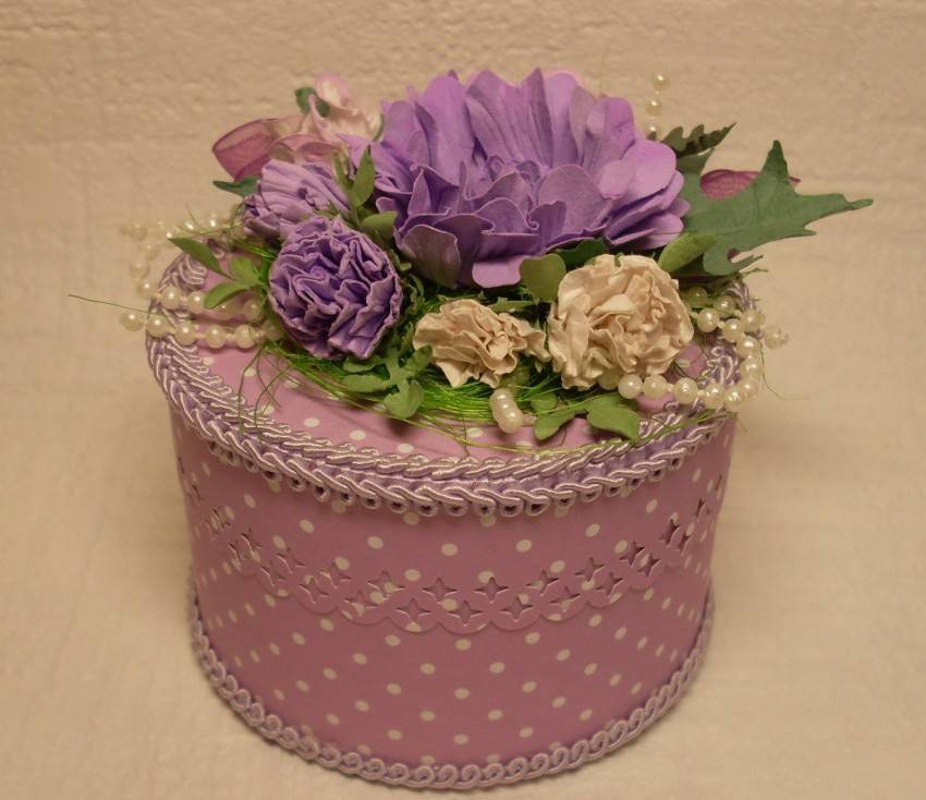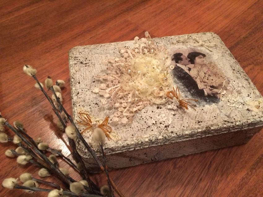 Внутри шкатулку обклейте декоративной бумагой, а сверху украсьте кружевом, рисунками в технике декупаж, готовыми цветами из ткани или бумаги, бусинами.