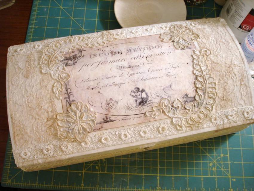 Декорируем шкатулку кружевом, бусинами, толстой нитью и другими элементами.