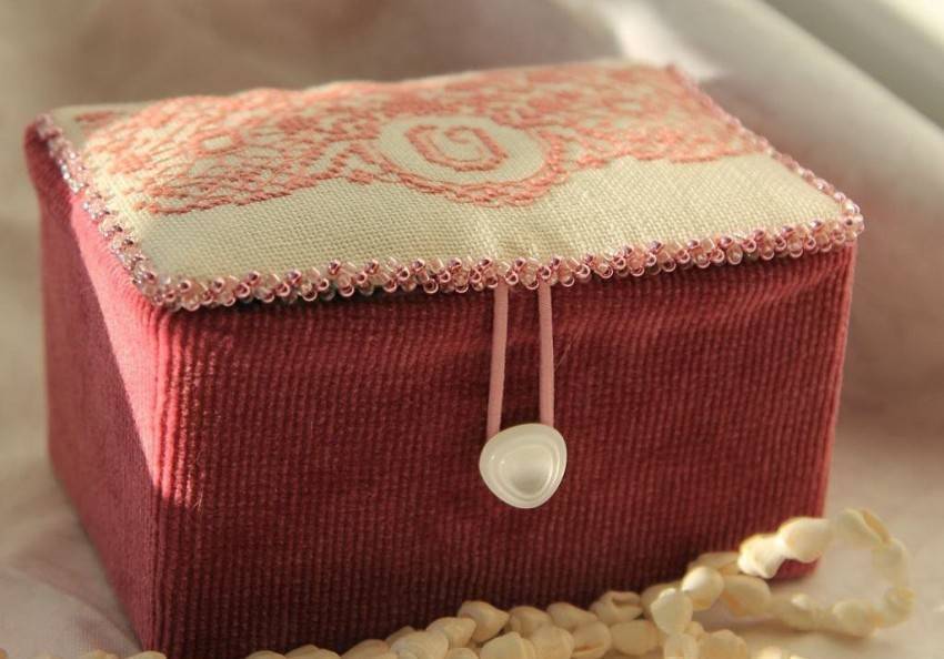 Шкатулка для ювелирных изделий готова. Она получилась простой и сдержанной, но можно добавить несколько декоративных элементов на крышку. Это могут быть искусственные цветы, бусины и стразы, яркий кант, кружево и любые другие украшения по вкусу.