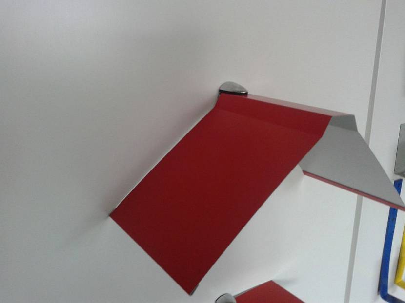 Для ломаной кровли из металлочерпицы не подходит деревянная конструкция, она нарушает эстетическое восприятие крыши дома. Поэтому на нее устанавливают готовые изделия из металла. Часто это легкий и стойкий к коррозии алюминий. При монтаже лестниц на ломаной кровле из металлочерепицы крепеж должен приходиться в нижнюю часть волны. Процесс начинается от карниза вверх. На боковые части изделия надевают кронштейны и размещаются через каждые 1,5 метра. В листах металлочерепицы сверлят отверстия, в которые помещают болты, соединяющие крепеж с обрешеткой. Уберечь покрытие от повреждений помогают резиновые прокладки. Верхний край крепится к коньку двумя скобами.