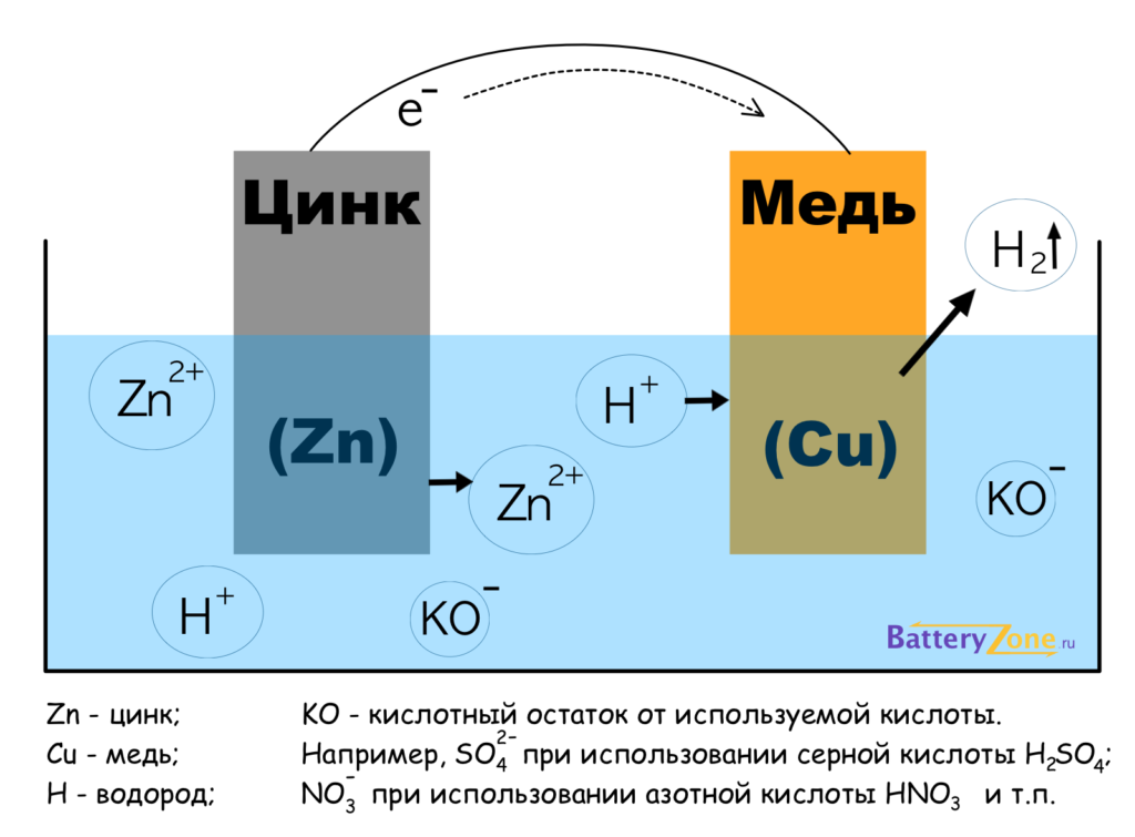 Электроны, используемые на медном электроде для образования молекул водорода, передаются от цинкового электрода через внешний провод, соединяющий медный и цинковый электроды. Молекулы водорода, образующиеся на поверхности меди в результате реакции восстановления выделяются в виде газообразного водорода.