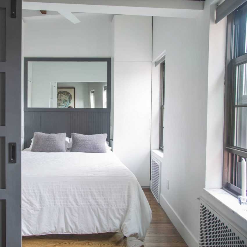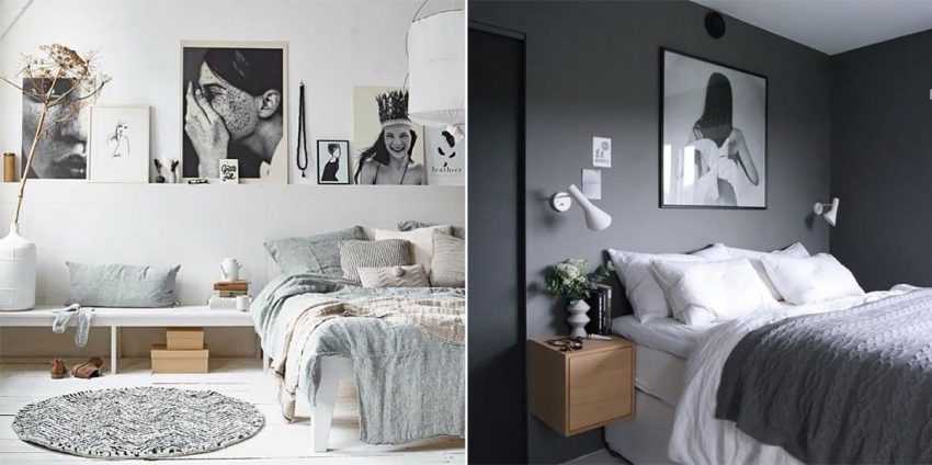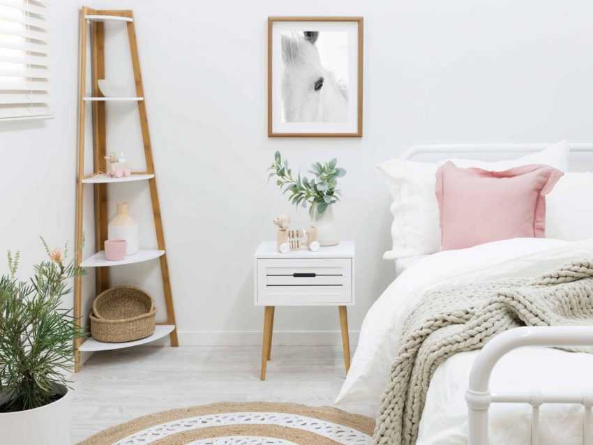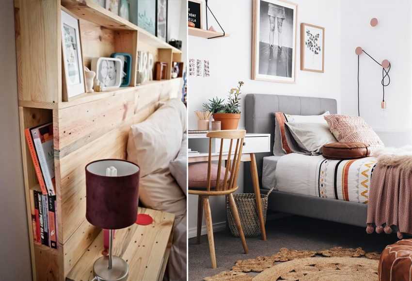 Если вы любитель почитать книгу на ночь или же не расстаетесь с мобильным телефоном перед сном, то нужно определиться, где их можно разместить. Поставьте рядом с постелью прикроватную тумбу. Чтобы сэкономить пространство, можно прикрепить небольшие навесные полочки.