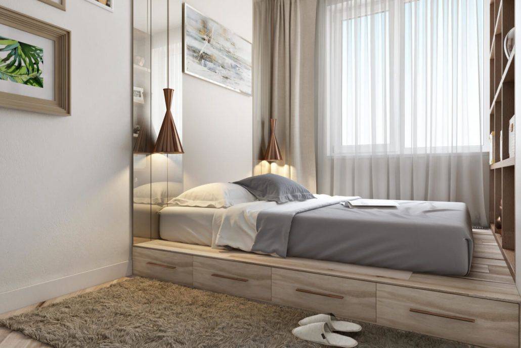Если спальня небольшая, внимание на специальные модели, которые изготавливают для маленьких помещений. Это может быть удобная кровать, спрятанная в шкафу, диван-кровать с полочками, с подъемным механизмом, кровать-шкаф и т