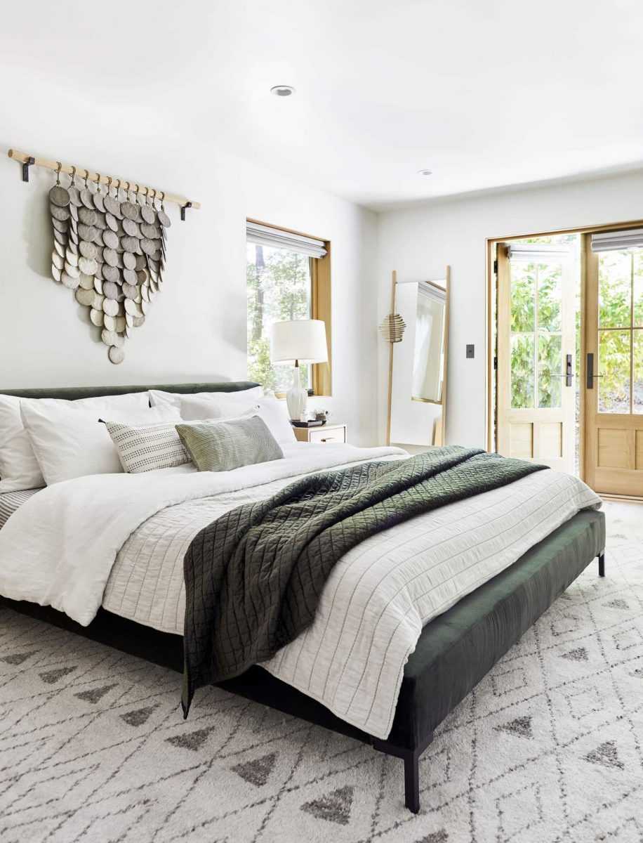 Модная сегодня интерпретация комнатного пространства ориентирована на минимализм, но не аскетичный и холодный как в хай-теке, а уютный и наполненный комфортом. На фото такой спальной комнаты отлично видно насколько удачно комбинируются в интерьере арт-объекты и вещи обыденного функционала, лаконичные формы и необычные декоративные элементы.