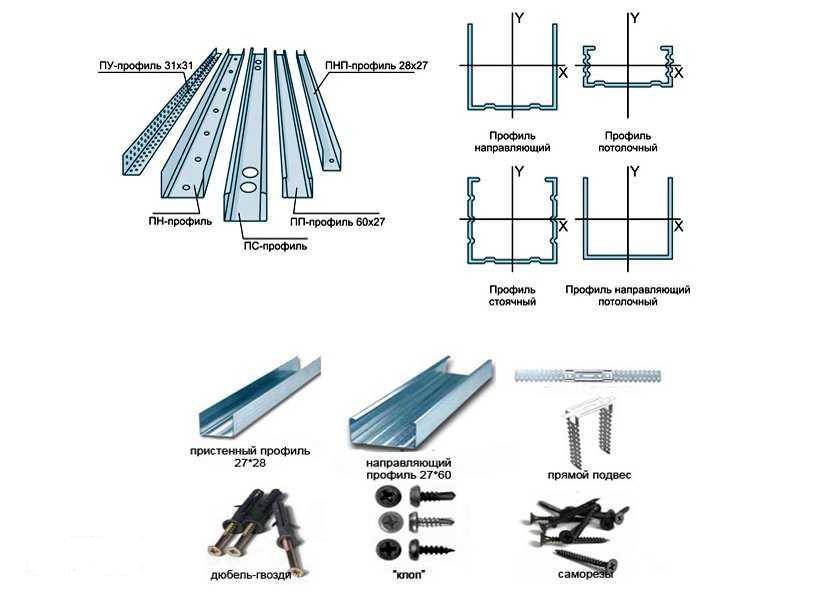 К стене и потолку профили крепятся при помощи П-образных кронштейнов, саморезов и дюбель-гвоздей «быстрый монтаж». Для скрепления профилей между собой можно использовать заклепки или просекатель (особые монтажные клещи). Деталей для крепежа выпускается множество, но при единичной работе своими руками большая часть из них не потребуется.