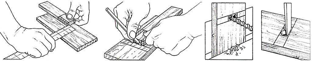 Как делается глухой паз (лунка) под шип, показано на рис. Если у вас есть ручной фрезер по дереву, то и выбирать лишек долотом не нужно, но засверлить края лунки надо: просто торцевой фрезой легко «уехать». В таком случае и края шипа делают скругленными, только аккуратнее и прочнее будет.