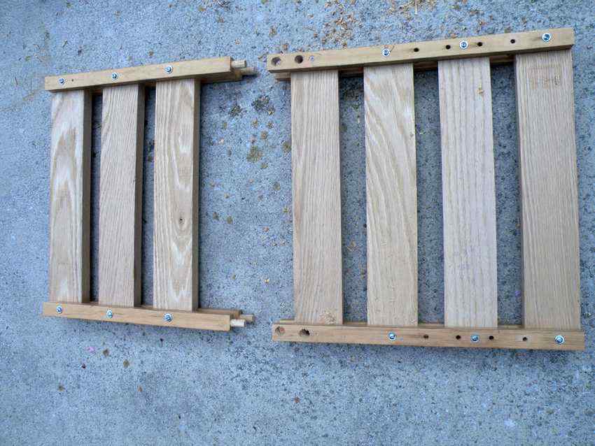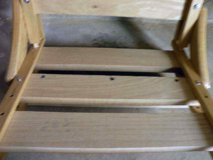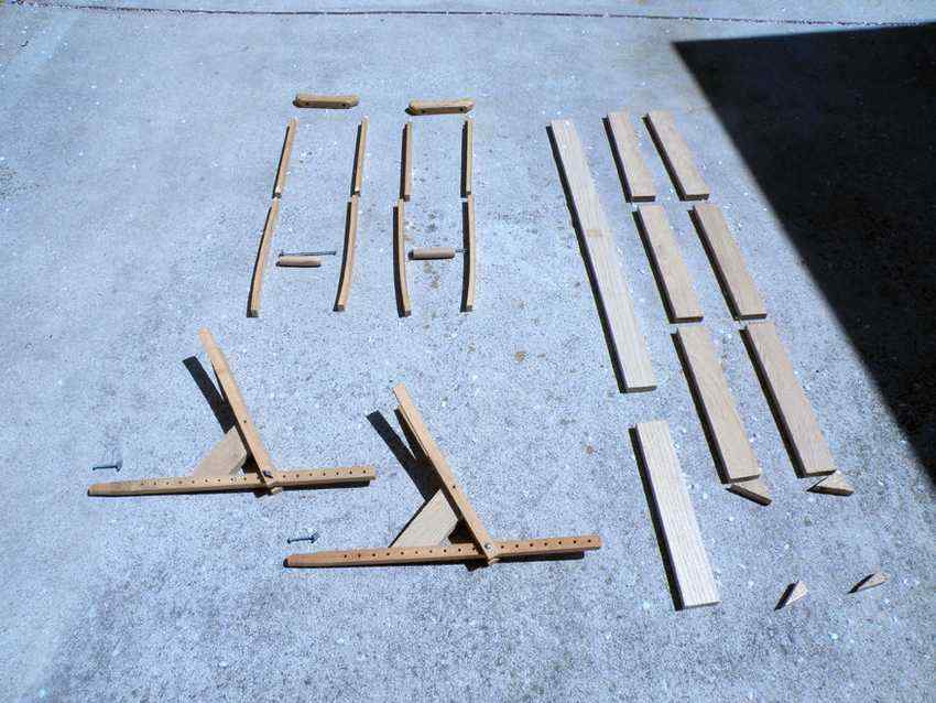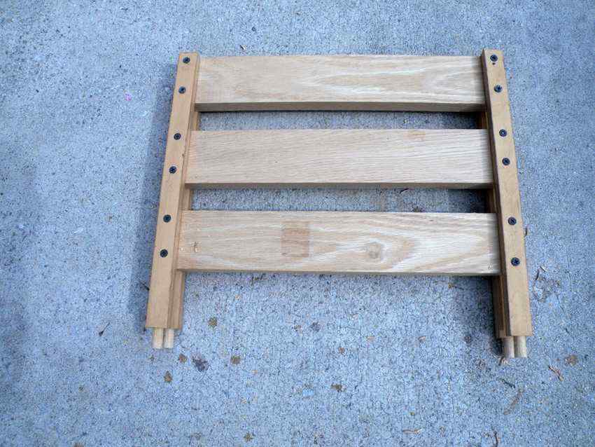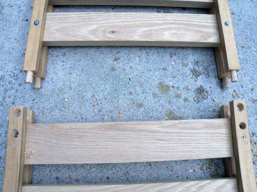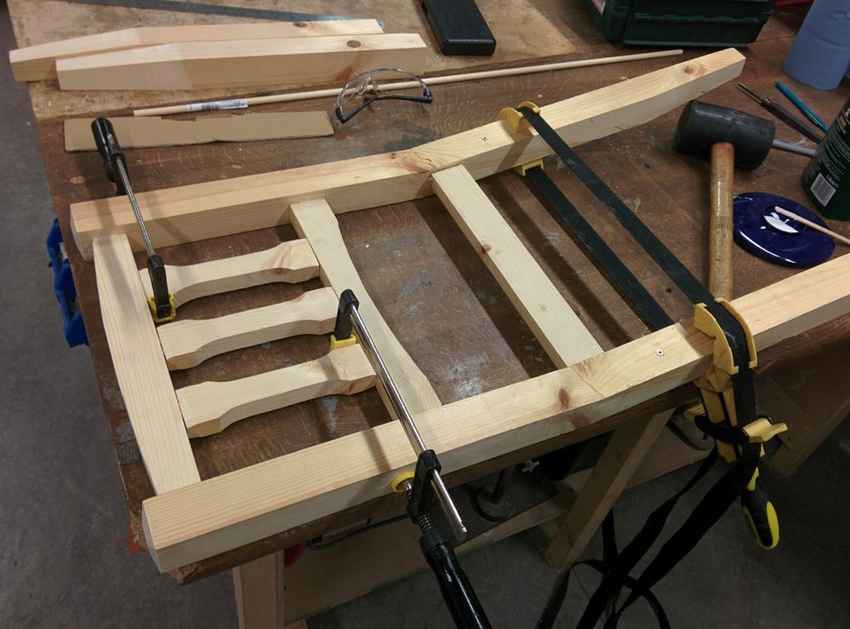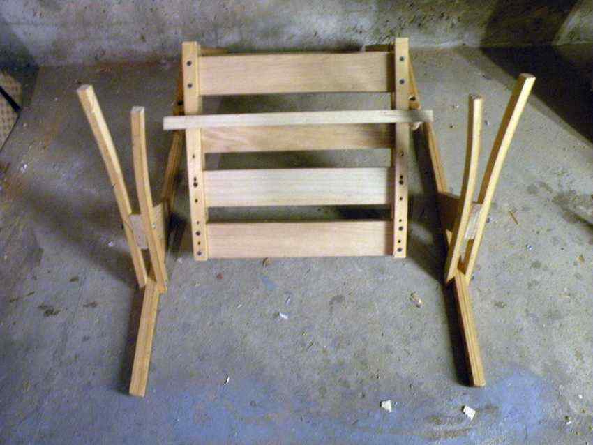 - После полного высыхания деталей прикручивают проножки, закрепляют рейки, монтируют сиденье.