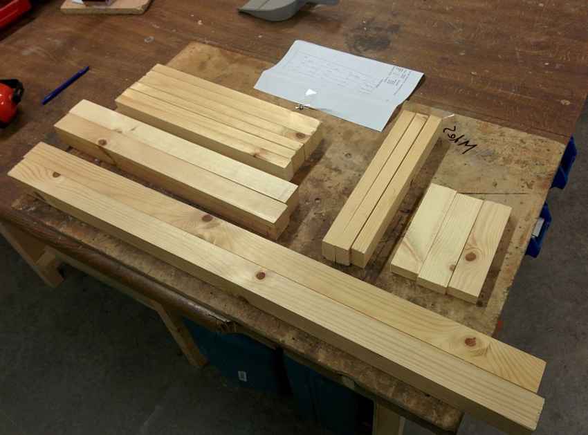 Когда чертежи готовы, нужно заняться подготовкой материалов. На дереве делают разметку, отмеряют нужную длину и отмечают те места, где в дальнейшем будет сделана разметка. После этого остается просто распилить массив в соответствии со схемой и можно приступать непосредственно к самой сборке.